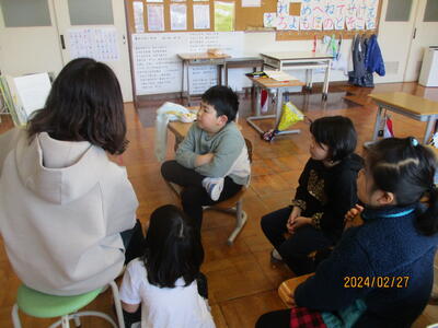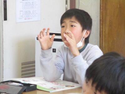 4年生の外国語活動の授業では,「今,何時で何をしているのか」を英語で詳しく伝え合っていました。とても和やかな雰囲気の中で,話したり,聞いたりすることができています。