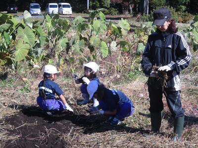 2023年10月26日 11時40分本日の3校時目、1・2年生がサツマイモの収穫を行いました。