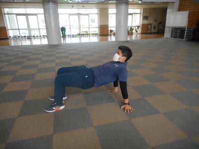 写真を持て、もう一度運動のしかたを確認してください。(モデルは体育主任の先生です。)