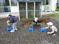 2020年5月21日 14時01分2年生の生活科です。昨日植えたミニトマトの鉢に、支柱を立てました。