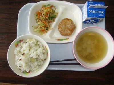2/13(木)の給食メニューは、コッペパン、野菜スープ、ハッシュポテト、グリーンサラダ、牛乳です。おいしくいただきました。ごちそうさまでした。