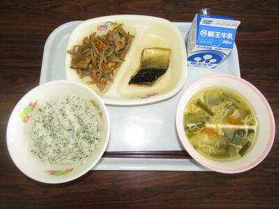 りごはん、あじの塩焼き、五目きんぴら、凍み