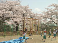 米小学校校庭の桜も、満開になりました。満開の桜の前で、子どもたちは、体育の授業で元気にかけっこをしたり、休み時間に思い思いの遊びを楽しんだりしていました。暖かい春を満喫していました。